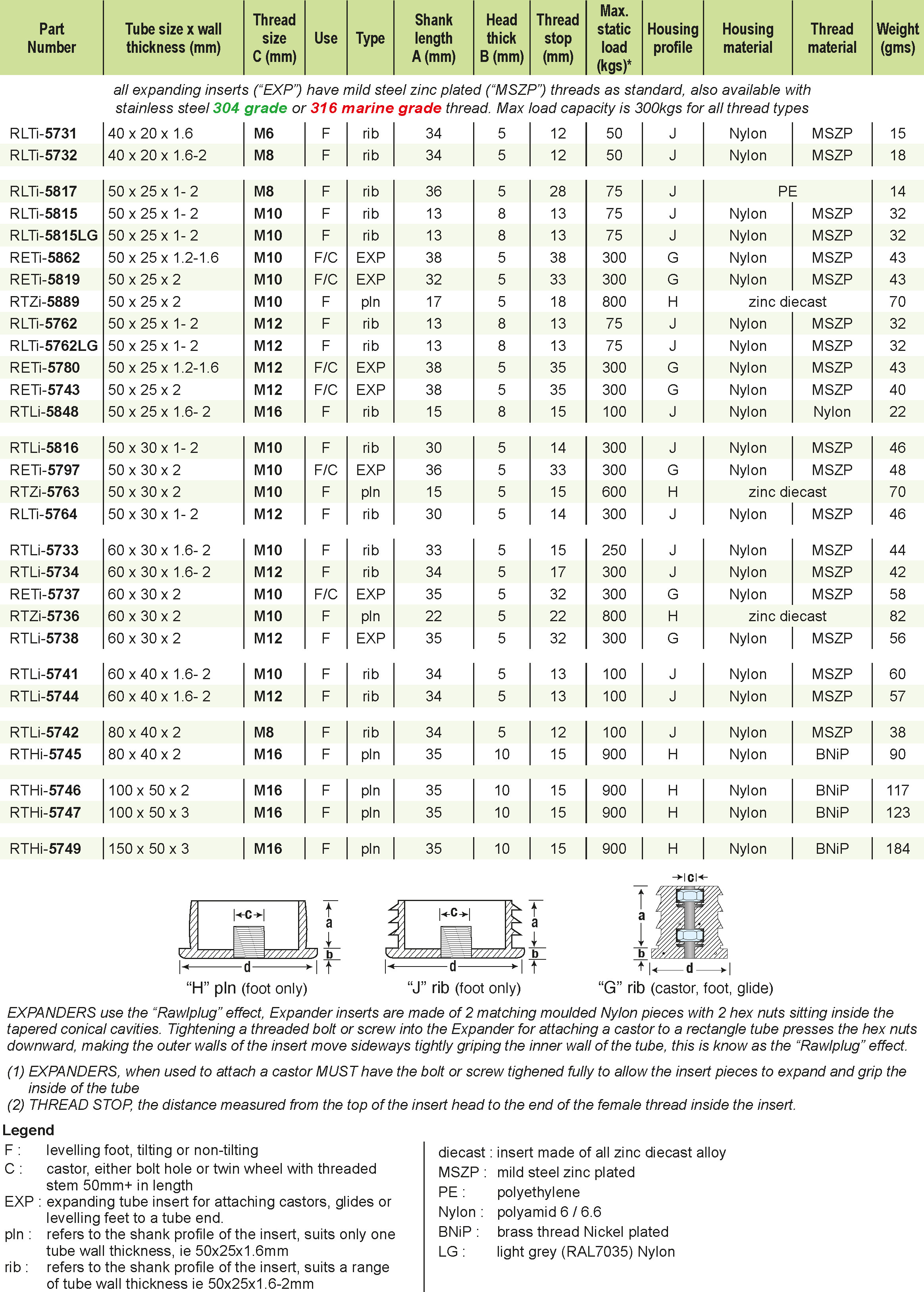 STAINLESS STEEL LEVELLING FEET & TUBE INSERTS